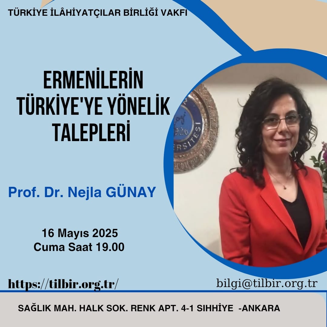 | 16 Mayıs 2025 Cuma günü akşam saat 19.00'da bakfımızda Prof. Dr. Nejla GÜNAY tarafından "Ermenilerin Türkiye'ye yönelik talepleri" konulu bir konferans gerçekleştirilecektir. |