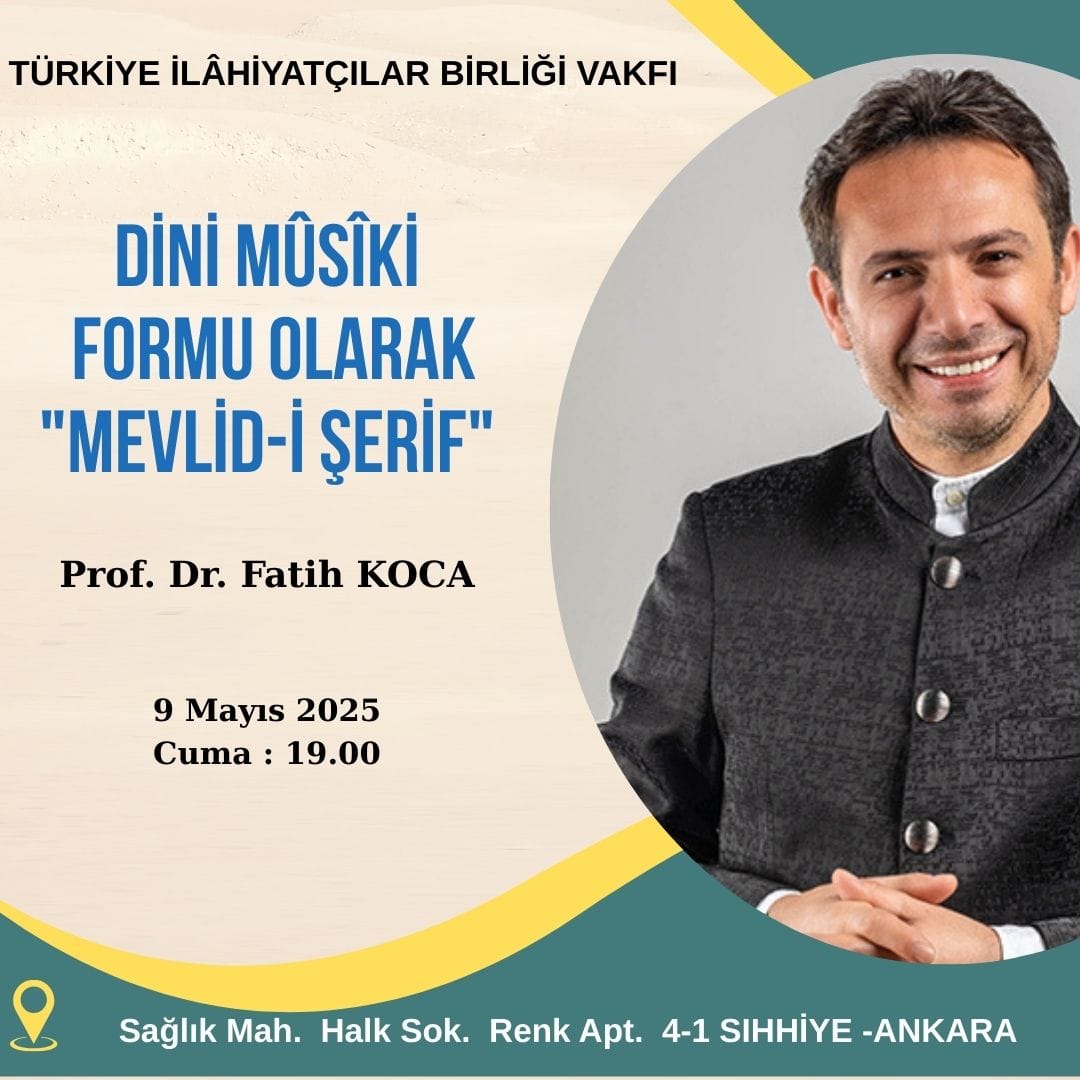 | 9 Mayıs 2025 tarihinde saat 19.00'da vakfımızda Prof. Dr. Fatih KOCA tarafından "Dini Musiki Formu Olarak Mevlid-i Şerif" konulu bir konferans gerçekleştirilecektir. |
