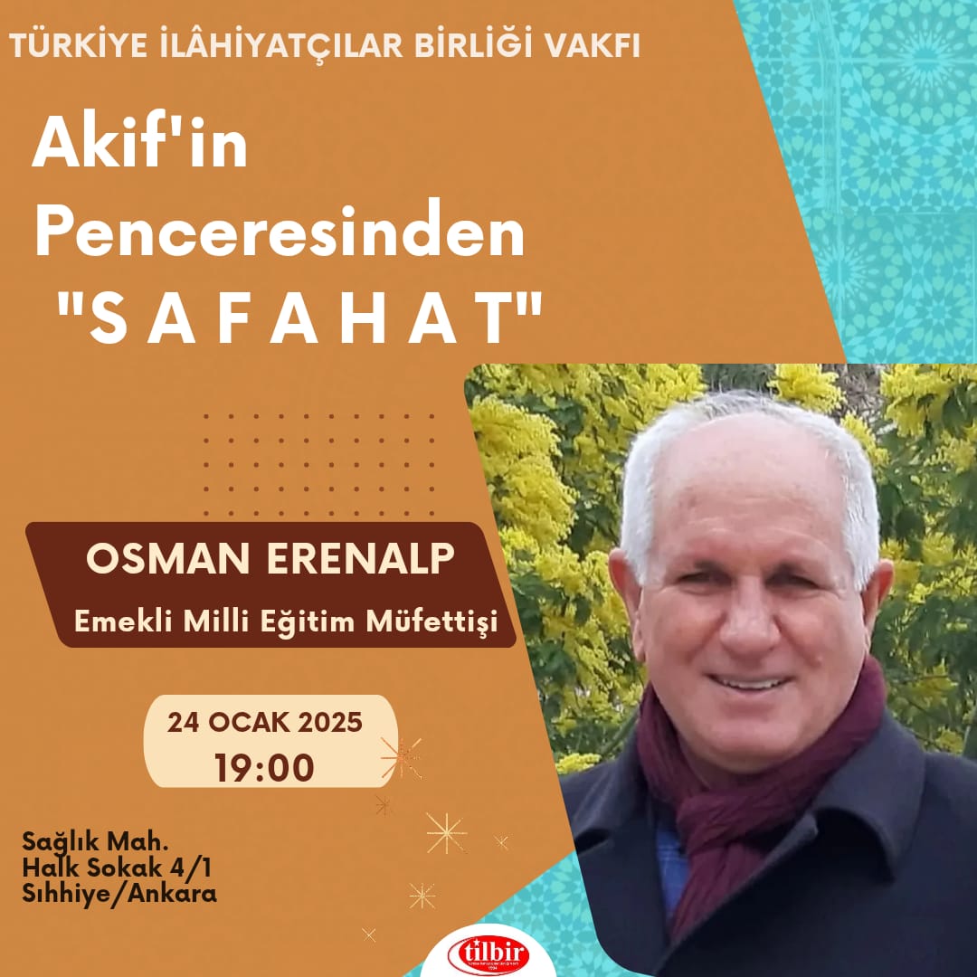 | Emekli Milli Eğitim Müfettişi Osman ERENALP 24 Ocak 2025 tarihinde saat 19.00'da vakfımızda Akif'in Penceresinden "Safahat" konulu bir konferans verecektir. |