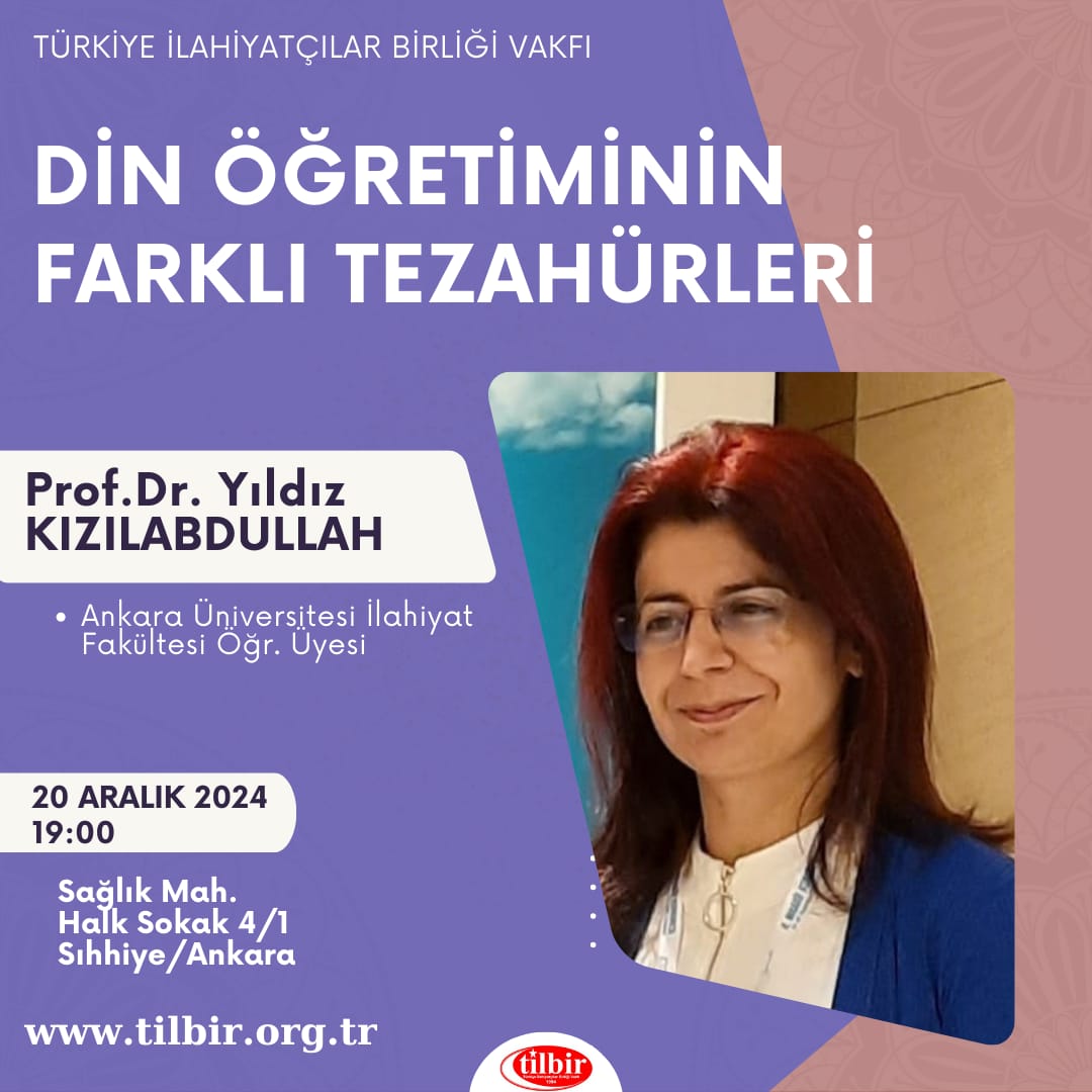 | Ankara Üniversitesi İlahiyat Fakültesi Öğretim üyesi Prof. Dr Yıldız KIZILABDULLAH 20.12.2024 tarihinde saat 19.00'da vakfımızın merkezinde Din Öğreniminin Farklı Tezahürleri konulu bir konferans verm |