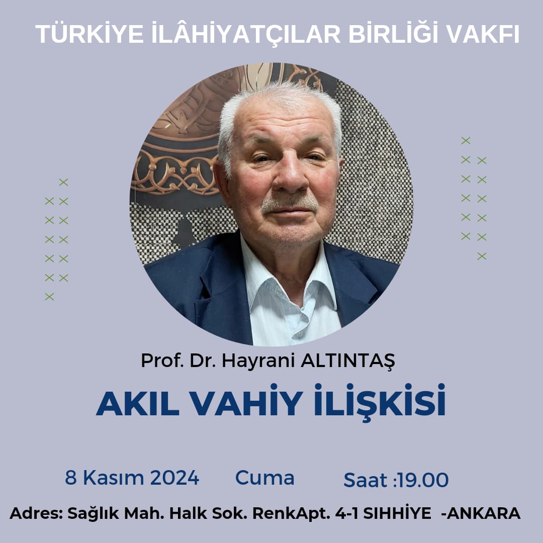 | Prof. Dr. Hayrani ALTINTAŞ 27 Aralık Cuma günü akşam saat 19.00'da vakfımızın genel merkezinde "Akıl Vahiy İlişkisi" konulu konferans verecektir. |